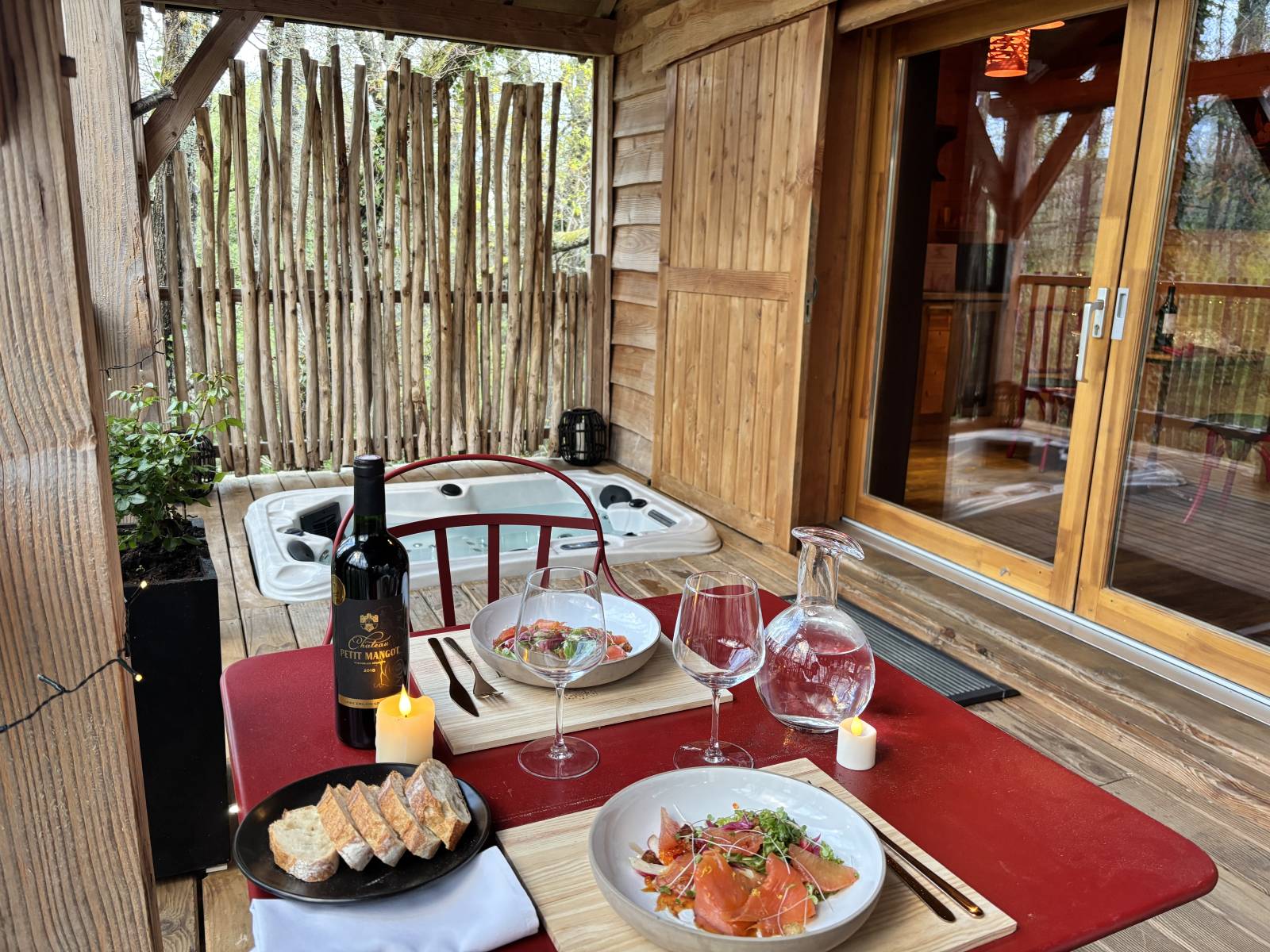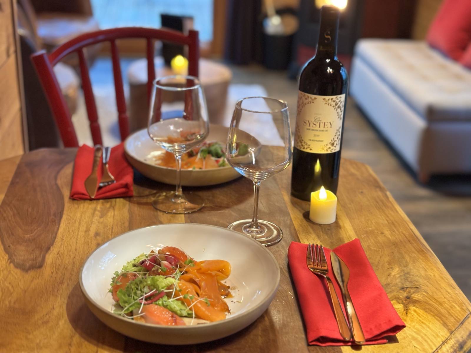 Accompagnez votre repas d'une bouteille de vin sélectionnée dans notre cave à vin, disponible dans votre lodge moyennant un supplément. Appréciez pleinement votre repas et votre séjour dans un cadre enchanteur.