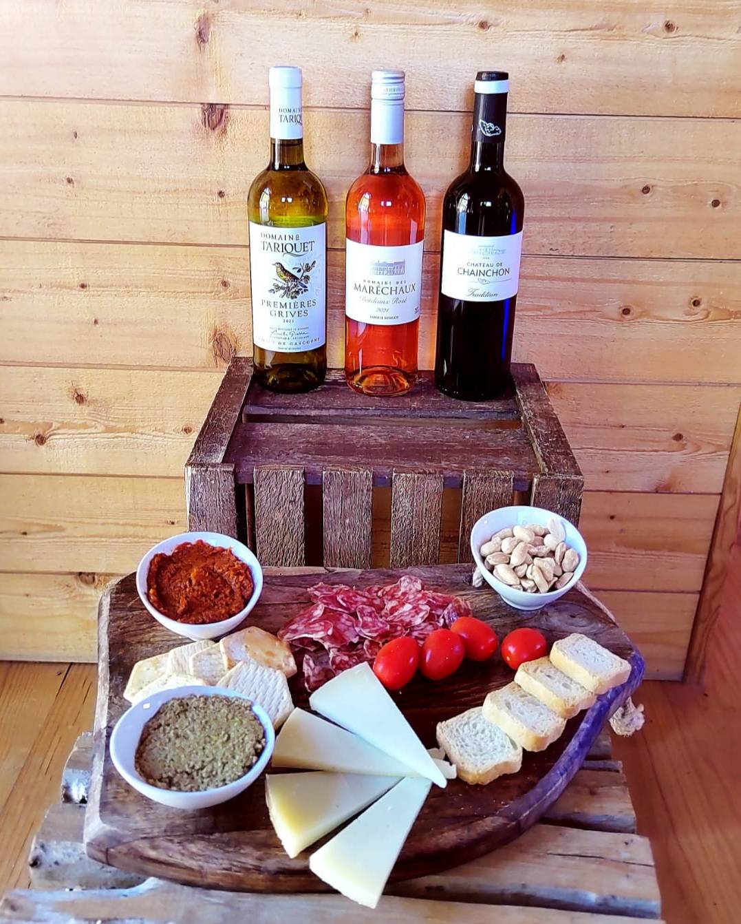 Vous y trouverez un savoureux assortiment à grignoter, comprenant saucisson, olives et fromage avec tapenade, accompagné d'une bouteille de votre choix parmi notre sélection de vins blancs, rouges ou rosés.