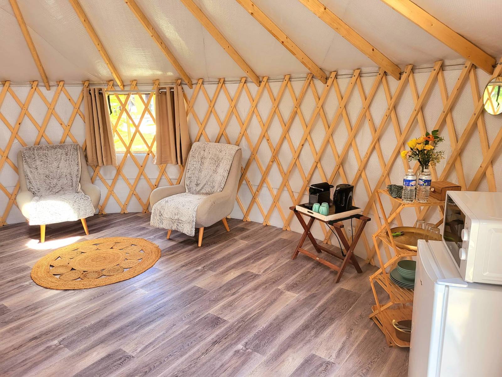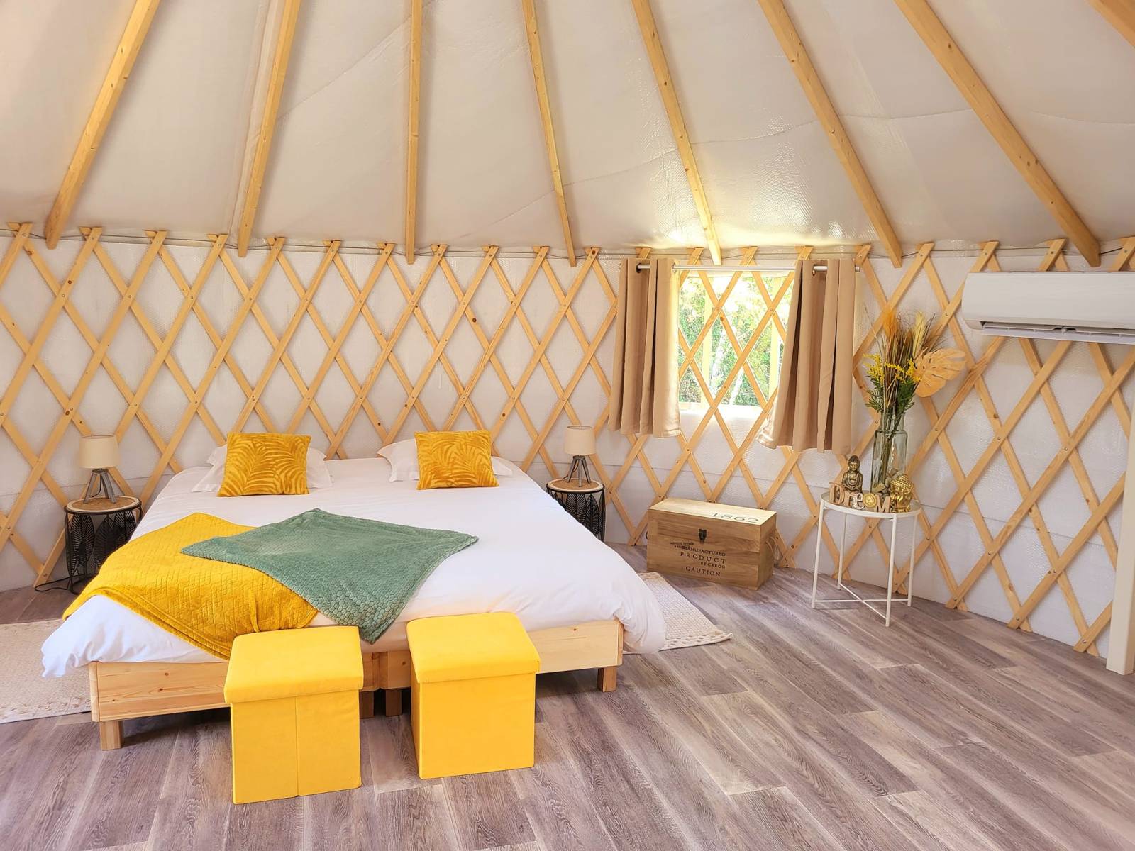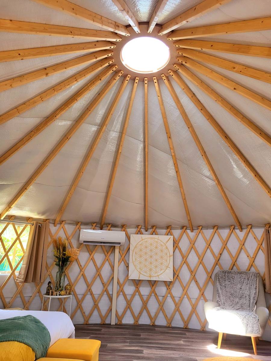 Notre Yourte est ouverte toute l'année, même en hiver, grâce à son système de chauffage par climatisation réversible. Son toit ouvrant vous permet même d'admirer les étoiles filantes.